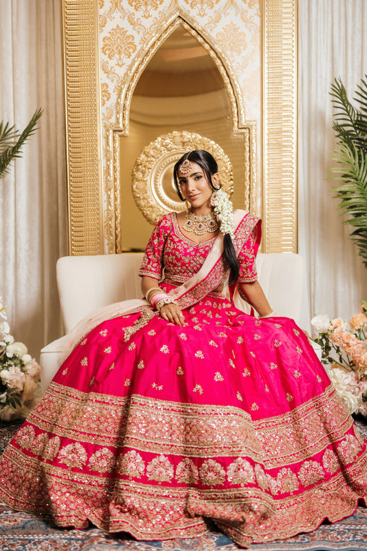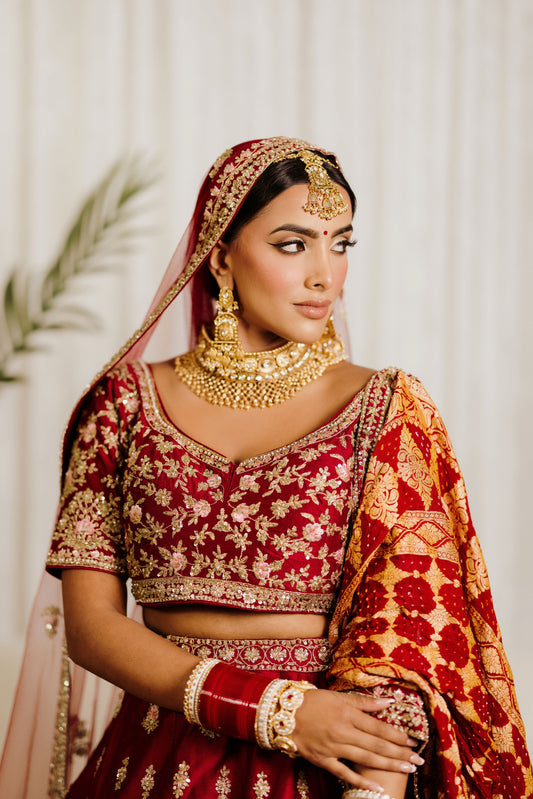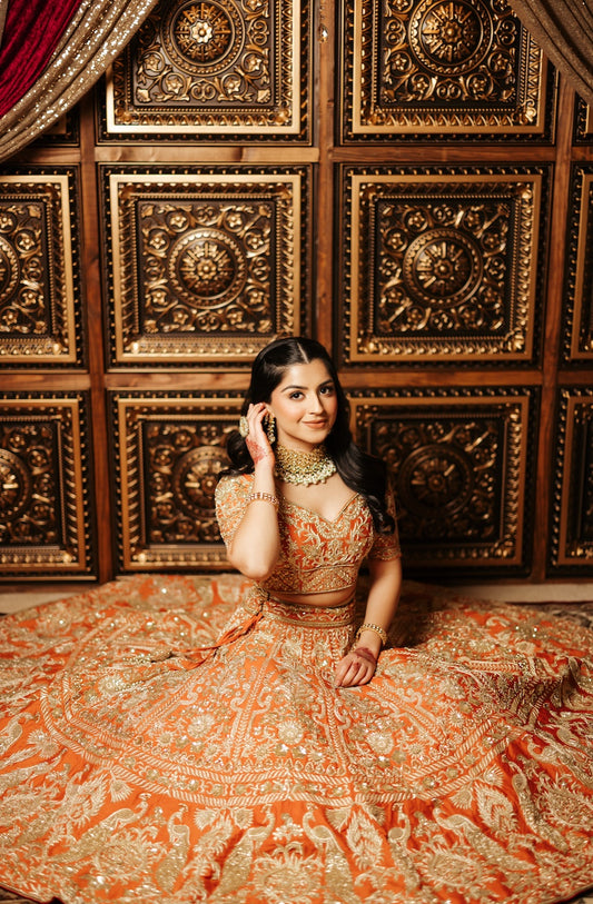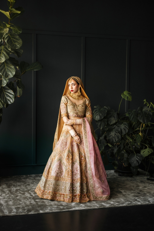 This bridal dress showcases rich craftsmanship with detailed embroidery and exquisite finishing. The structured bodice and flowing silhouette come together to create a look that is both regal and deeply rooted in tradition.