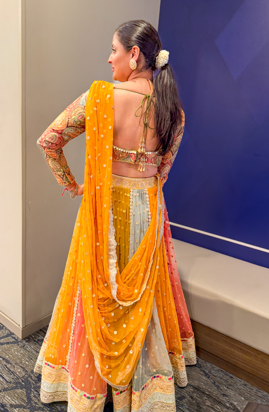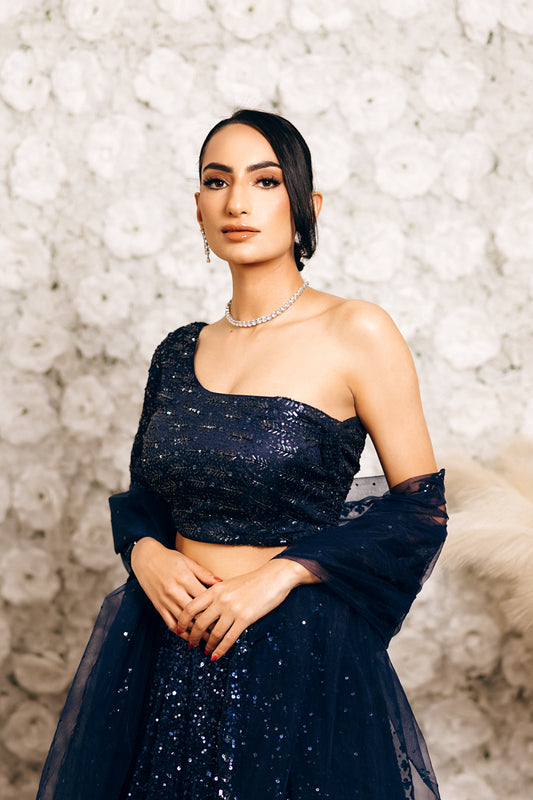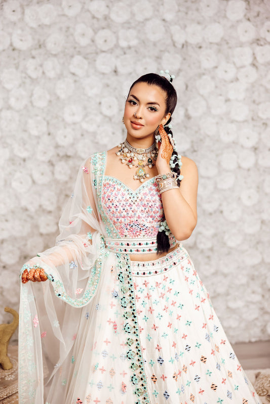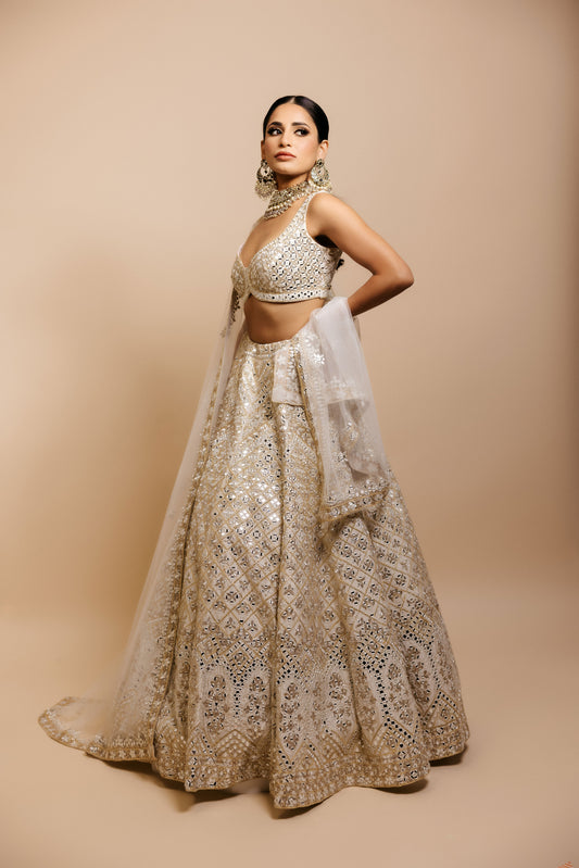 Step into elegance with this stunning lehenga, crafted to blend traditional artistry with modern charm. The skirt features graceful flare and intricate embellishments, paired with a beautifully designed blouse for a flattering, timeless silhouette.