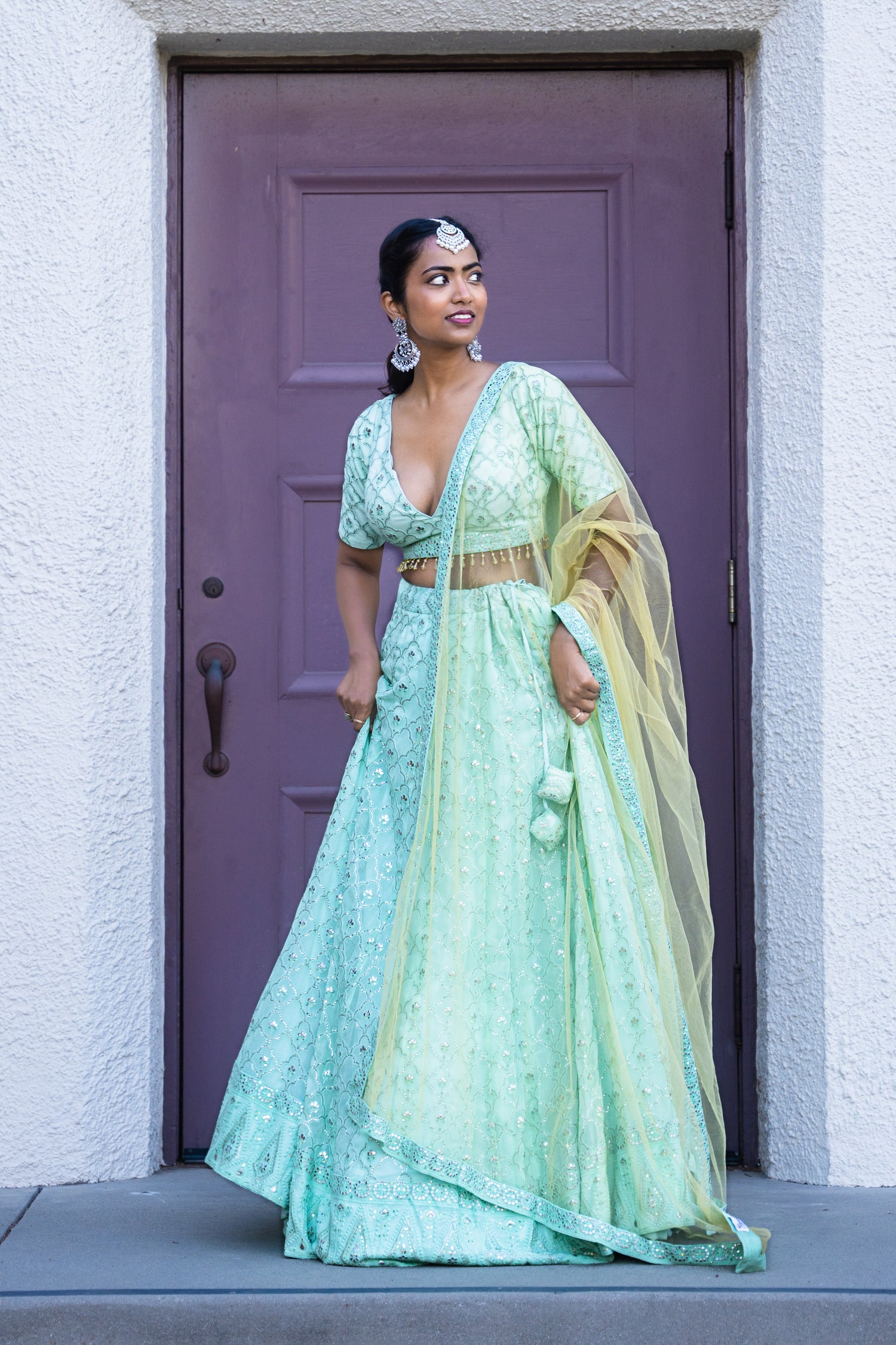 This exquisite lehenga comes alive with vibrant energy and refined elegance, capturing the essence of effortless grace and poise. With its flowing silhouette and delicate craftsmanship, it’s a perfect choice for weddings, festive celebrations, or any occasion where timeless beauty meets dynamic charm—a true celebration of artistry in motion.