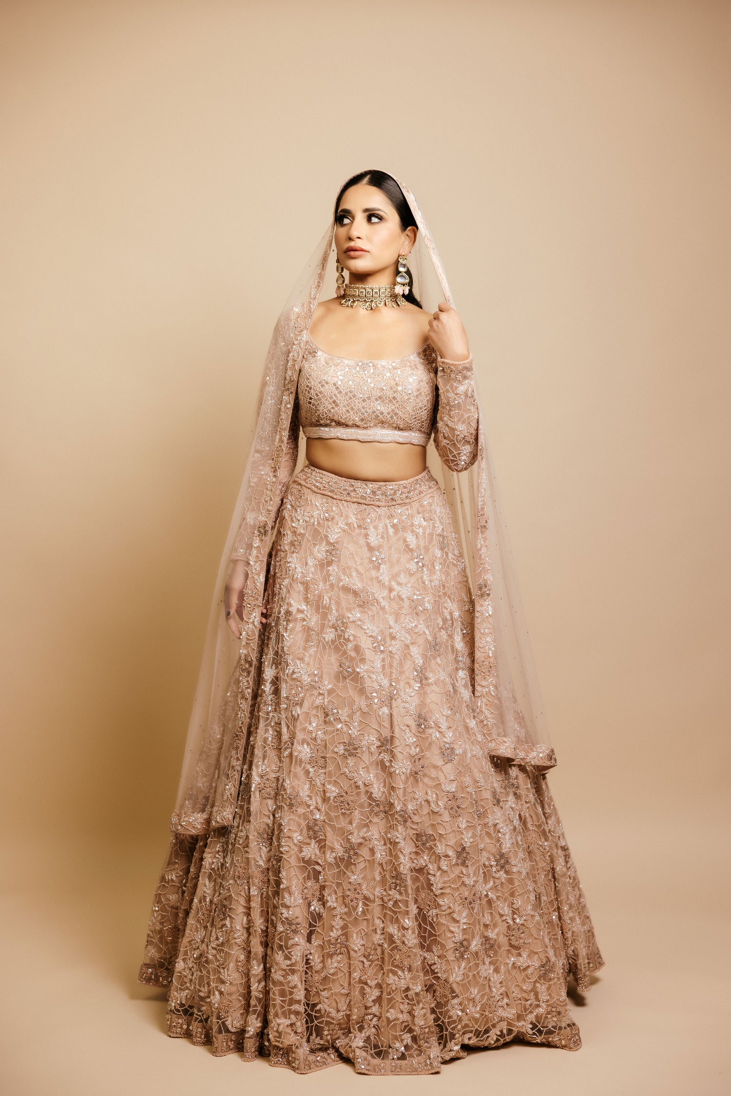Bathed in a serene nude-blush palette, this lehenga is the epitome of soft sophistication. Its panels are adorned with delicate, hand-worked motifs that shimmer gently with every step, creating an aura of understated luxury. Paired with a feather-light dupatta that drapes like a poetic sigh, this ensemble is crafted for the bride who speaks in elegance, moves with grace, and captivates without trying.