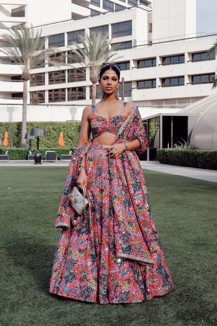 Worn by Geena Singh to a close friend’s wedding celebration, this vibrant lehenga made an unforgettable statement. The rich blend of colors and fluid silhouette brought effortless movement and modern glamour to the festivities. Styled with confidence and grace, the look perfectly captured the spirit of celebration — bold, radiant, and undeniably couture.