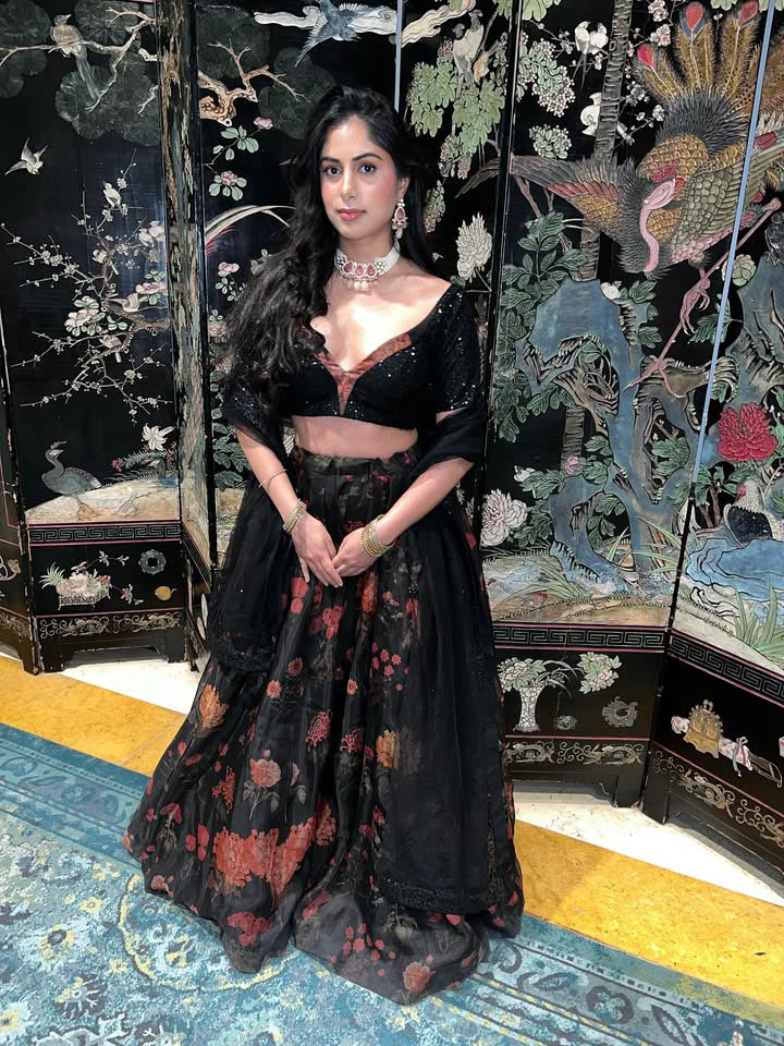 Spotted the gorgeous stun in our exquisite black lehenga, adorned with vibrant floral motifs and a touch of shimmer. This ensemble isn't just a statement; it's a mood-graceful, fierce, and unforgettable. Would you dare to bloom in black?