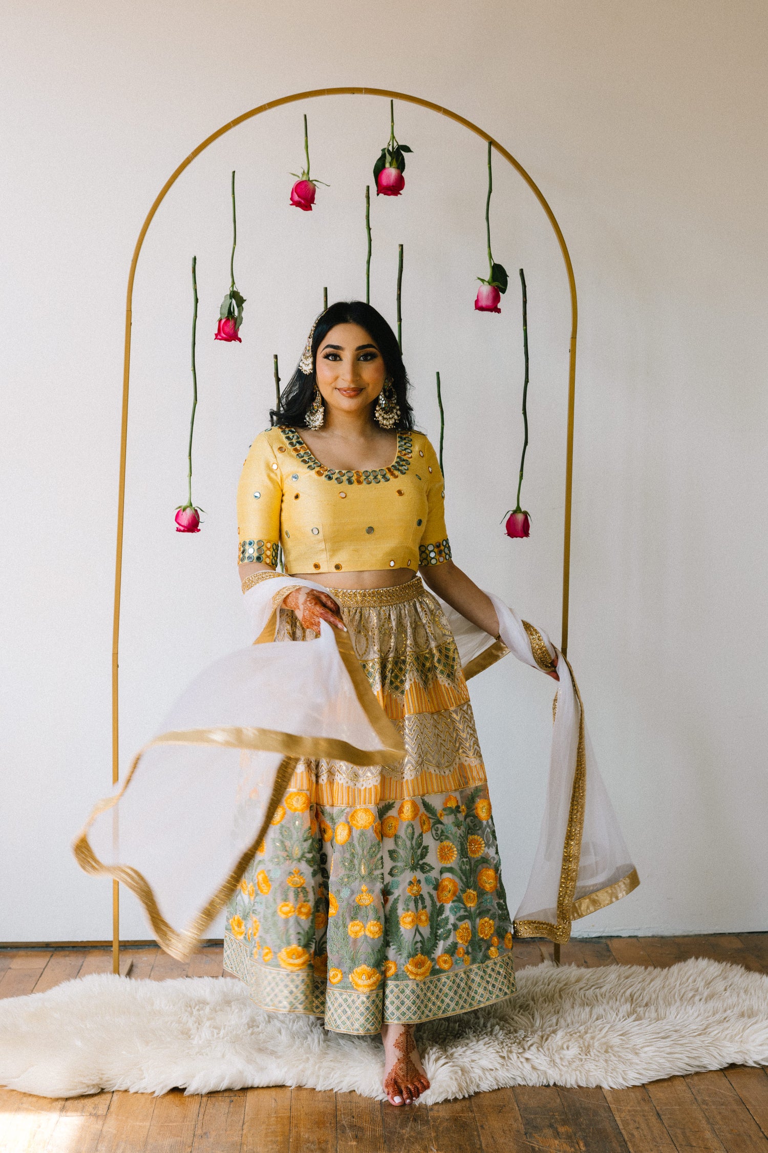 A burst of sunshine in every twirl, this lehenga is a perfect ode to the blooming beauty of nature. The intricate floral embroidery dances gracefully across the skirt, bringing to life the charm of a blooming garden. The delicate mirror work on the blouse adds a touch of sparkle, like dew drops catching the morning light. Paired with bold earrings and a radiant smile, this look celebrates femininity and joy in its purest form! 🌼