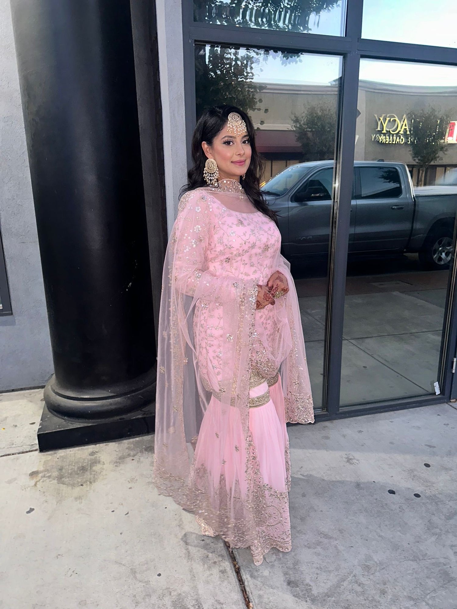 Pretty in pink and radiating effortless grace, this dreamy blush pink gharara is crafted to celebrate elegance and charm. Soft, delicate, and utterly stunning, it’s designed for festive occasions, special gatherings, or any moment where you want to shine with timeless sophistication.