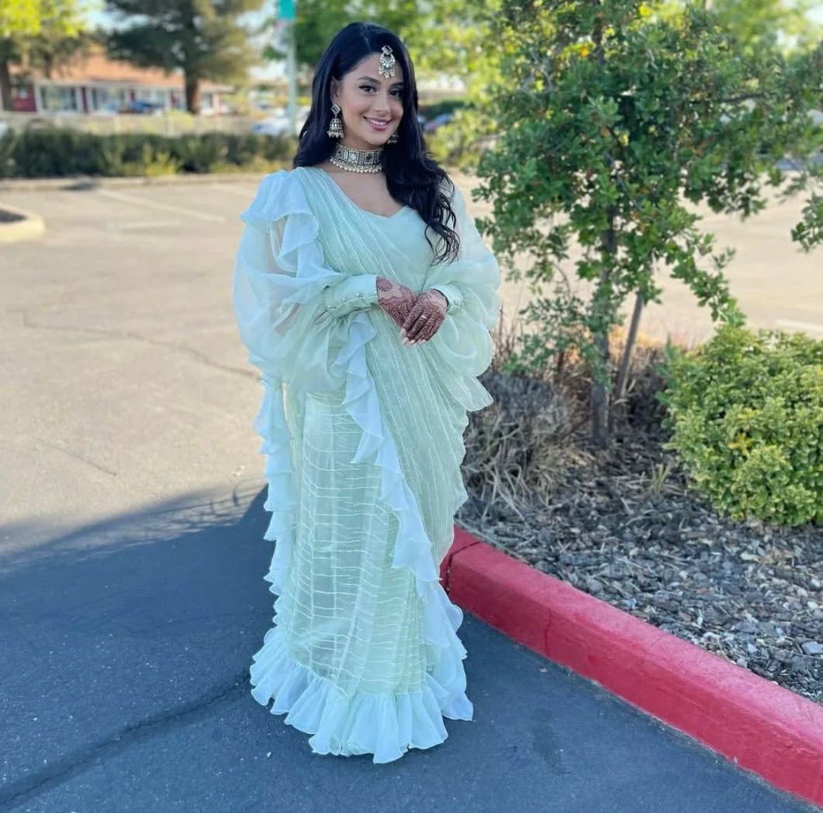 Worn by Manpreet Toor at her close friend’s wedding reception, this organza ruffle saree made a stunning statement of modern elegance. Styled effortlessly for an evening of celebration, the pre-stitched silhouette and cascading ruffles brought graceful movement to every step — perfectly blending tradition with contemporary flair.